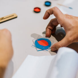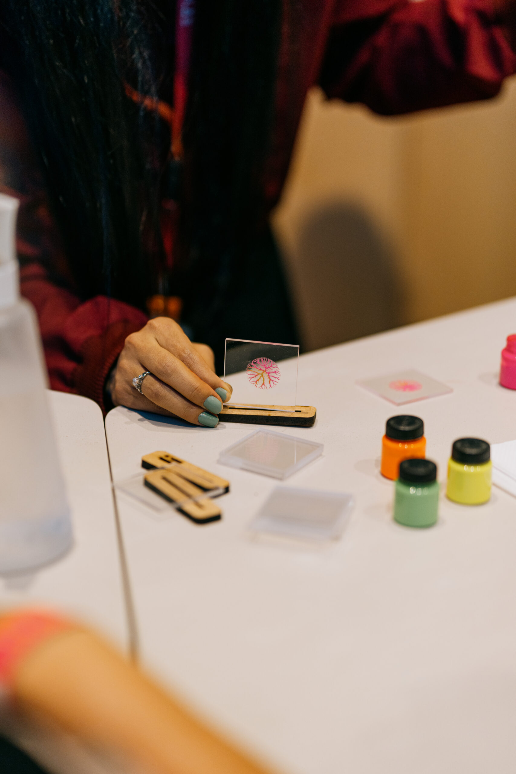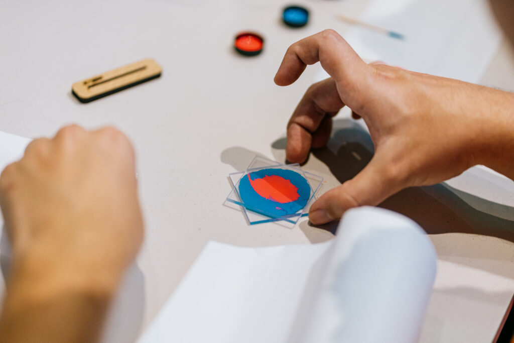 Basta uma gota de tinta prensada entre duas placas de acrílico para formar uma imagem fractal. Nesta experiência, os visitantes são convidados a criar suas próprias formas fractais, usando diferentes cores sobre as placas, e depois levar de recordação.